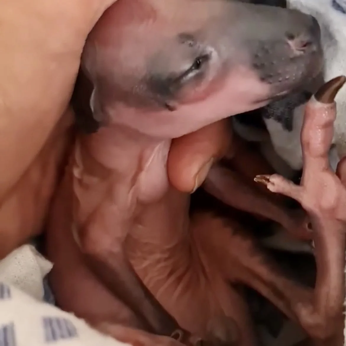Carefully open the pouch. If there is a baby kangaroo inside, cup your hands under the baby (if they are not attached to a teat) and place the baby into a ‘pouch’ – this could be your shirt, a cotton bag, etc. Hold the baby close to you for warmth and the sense of security of hearing your heartbeat.